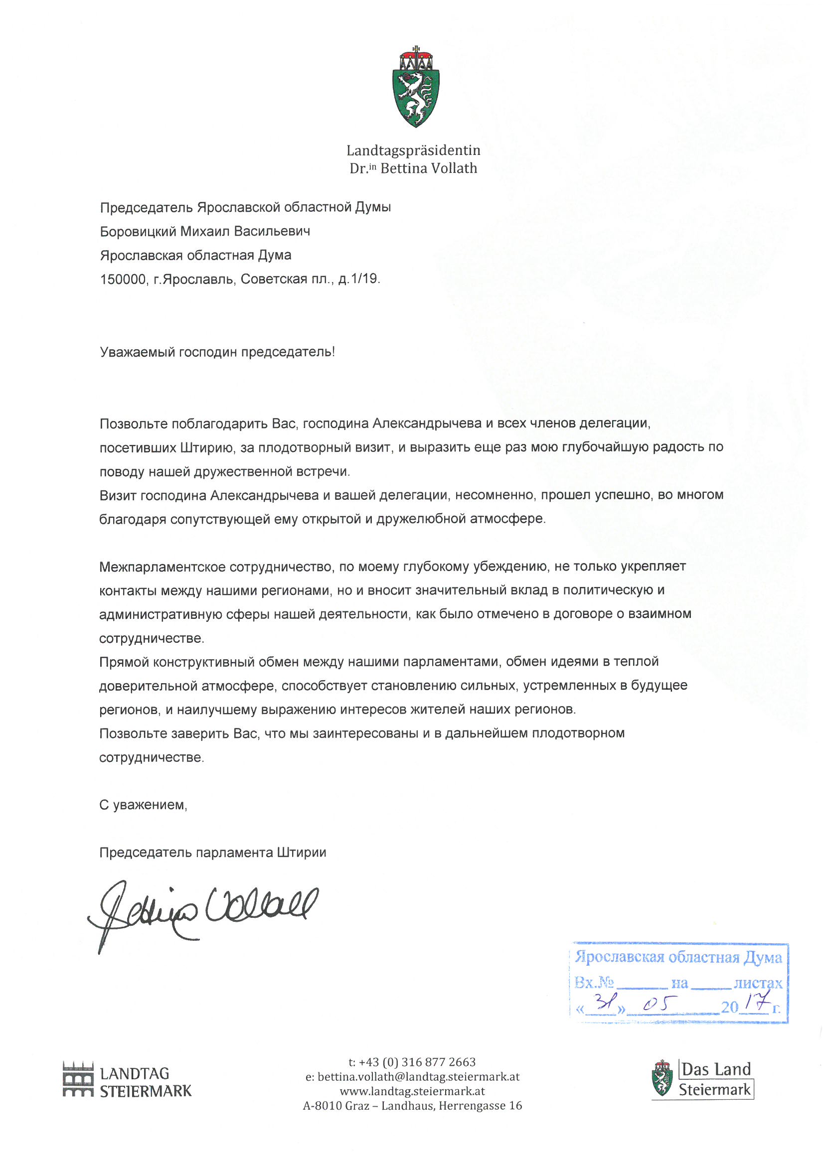5-7 апреля 2017 года делегация Ярославской областной Думы посетила столицу Федеральной земли Штирии город Грац. Это был третий официальный визит ярославских законодателей в Австрийскую Республику. По итогам мероприятия в адрес Председателя Ярославской областной Думы Михаила Боровицкого поступило письмо, в котором была высказана благодарность за плодотворный визит и выражена глубочайшая радость по поводу состоявшейся дружественной встречи.