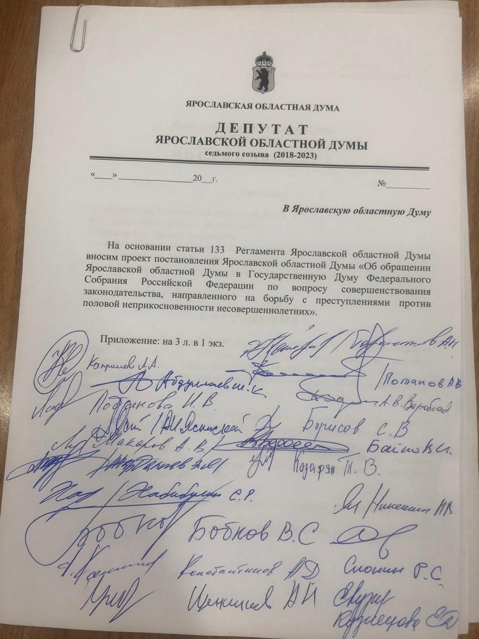 Сегодня в Ярославскую областную Думу группа депутатов от различных фракций внесли обращение в Государственную Думу Российской Федерации по вопросу совершенствования законодательства, направленного на борьбу с преступлениями против половой неприкосновенности несовершеннолетних. Как говорится в тексте обращения, устойчивый рост таких преступлений вызывает озабоченность. Количество возбужденных уголовных дел увеличилось с 13487 в 2017 году до 14755 в 2019 году.